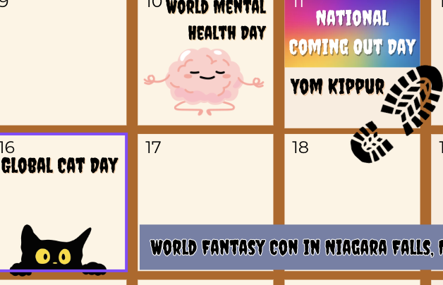 (screenshot of october calendar page including Global cat day and National Coming Out day.)