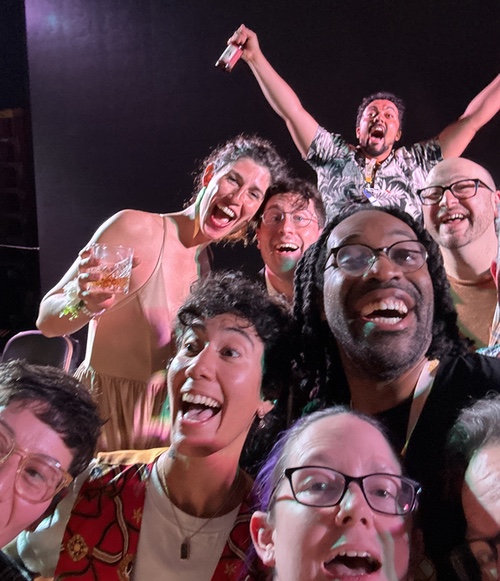 Foreground, MariNaomi, Vico Ortiz, Mur, sliver of Paul's head. Second row: Tochi Onyebuchi. Third row, Daphne Always, James Sheppard, and Josh Gondelman. in the back Jasper William Cartwright makes an impressive leap.