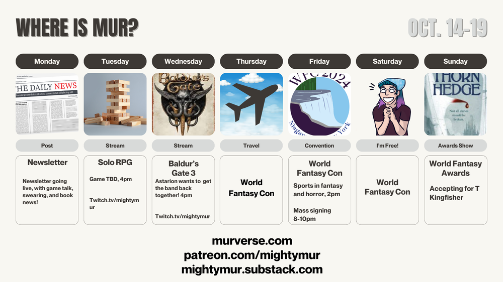 - Mur is co-editor of Escape Pod, which will be celebrating it’s 20th year and thousandth episode in 2025!
