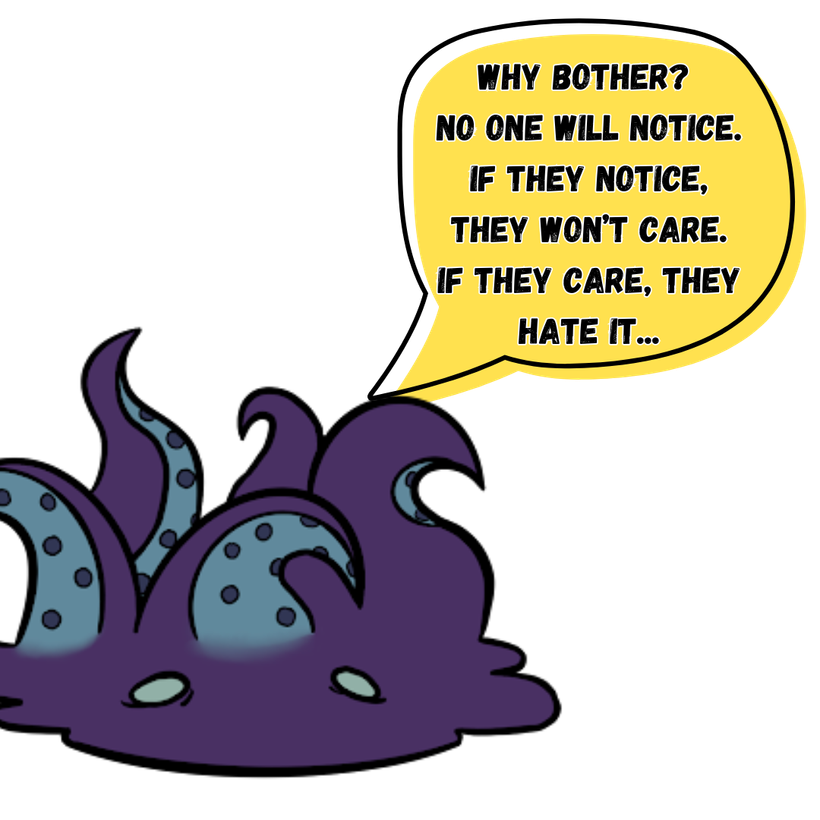 ALT- illustration of another one of my bullies, a purple puddle with tentacles saying "Why bother? no one will notice. If they notice, they won't care, if they care, they hate it." Art by numbersninja